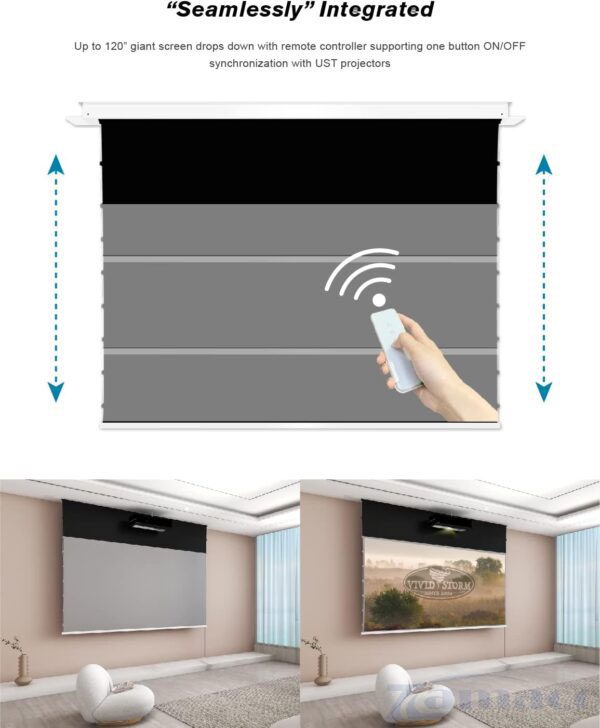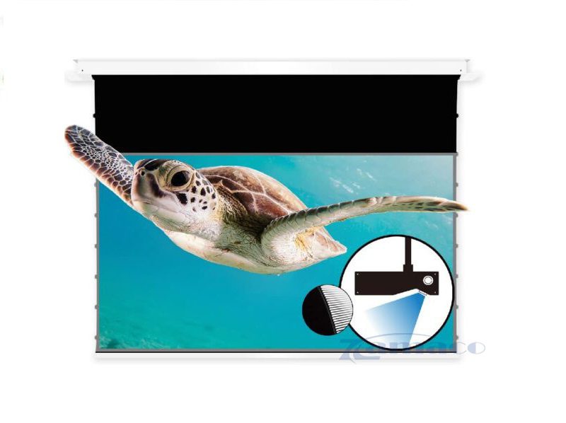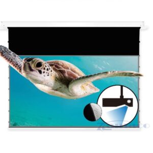 – Kiểu màn chiếu: Điều khiển điện (remote IR + RF), căng phẳng Tab-tensioned
